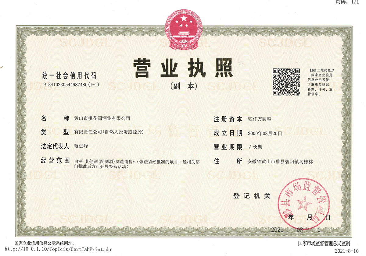- 黃山市桃花源酒業有限公司坐落在古徽州腹地,黃山南麓的黟縣。這里是新安江和青弋江的發源地,歷來有徽商之源和桃花源里之稱;這里人文薈萃,徽文化歷史厚重,西遞、宏村古村落被聯合國命名為世界文化遺產;這里的生態自然,得天獨厚,枧溪大峽谷的源頭水流入漳河,穿黟城而過,千百年來滋養著勤勞智慧的古黟人民,滋潤兩岸...